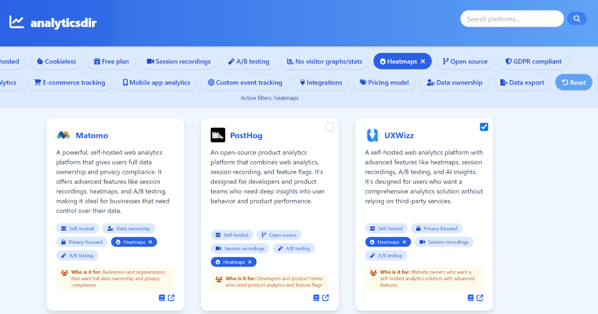 - ✓ og:description — Discover, compare, and choose the best web analytics platforms for your website or business. Filter by privacy, features, price, and more. Find alternatives to Google Analytics, Matomo, UXWizz, and more!