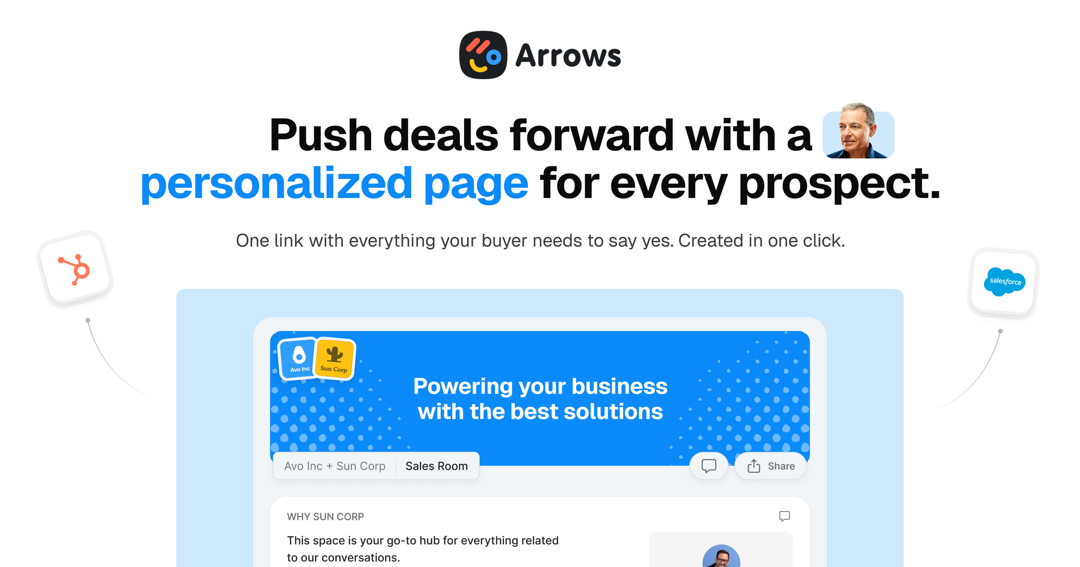 - ✓ og:description — Turn every deal into a personalized follow-up link. Arrows creates AI-generated digital sales rooms connected to HubSpot and Salesforce—so sales reps can share one page for every prospect, track engagement, and keep momentum moving toward closed-won.