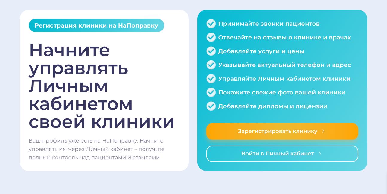 - ✓ og:description — Зарегистрируйтесь в Личном Кабинете Клиники на сервисе НаПоправку и начните получать пациентов онлайн