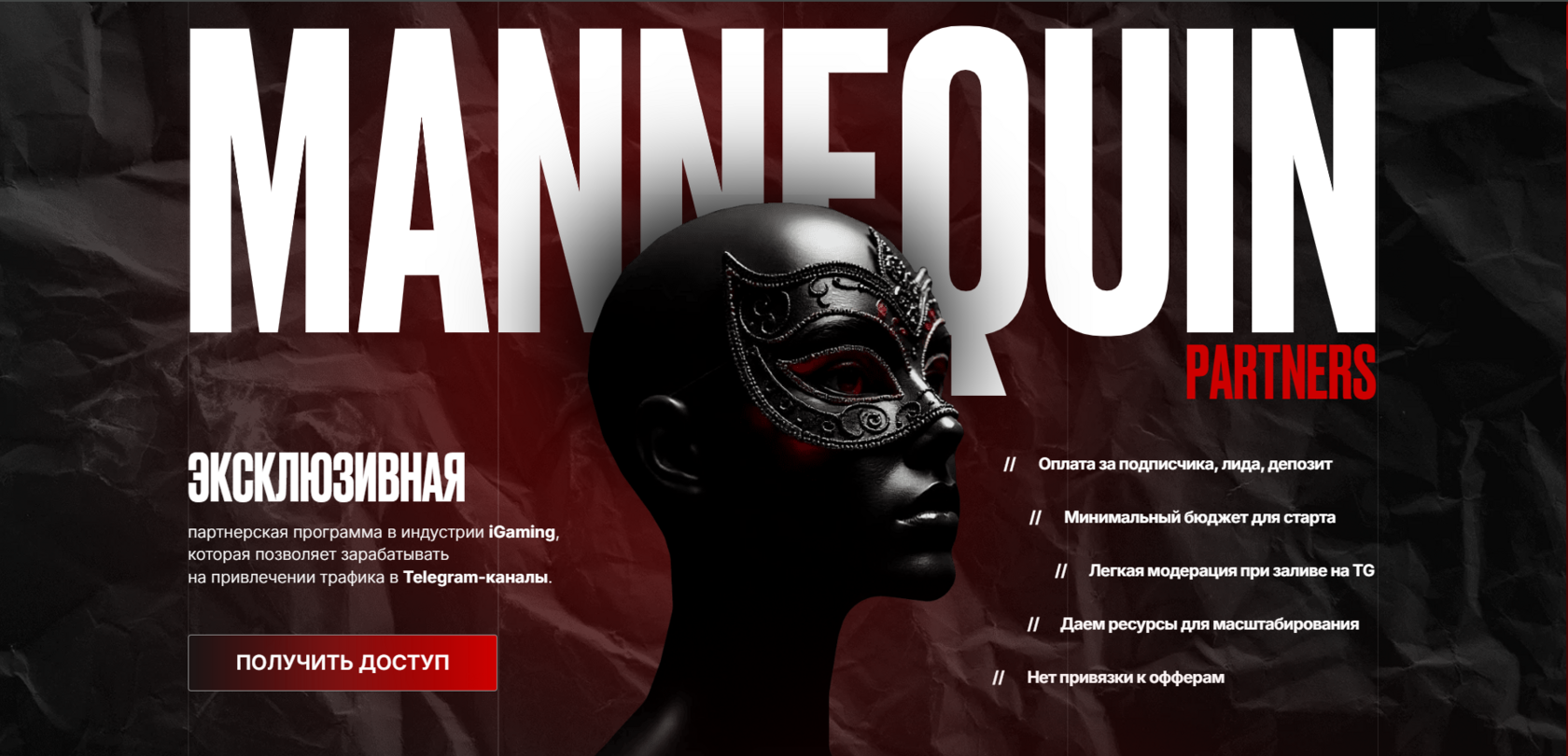 - ✓ og:description — Эксклюзивная партнерская программа в индустрии iGaming, которая позволяет зарабатывать на привлечении трафика в Telegram-каналы.