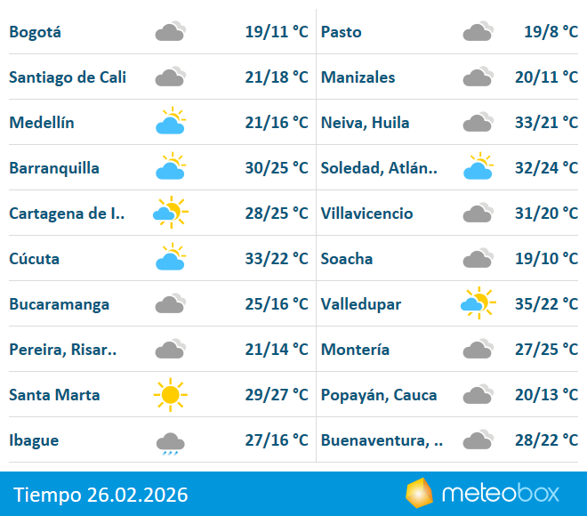- ✓ og:description — Predicción del tiempo Colombia El tiempo para cada ciudad y pueblo. El tiempo del Sistema meteorológico noruego para hoy, el tiempo mañana, la previsión del tiempo por horas. Temperatura, precipitación, viento, nubosidad.
