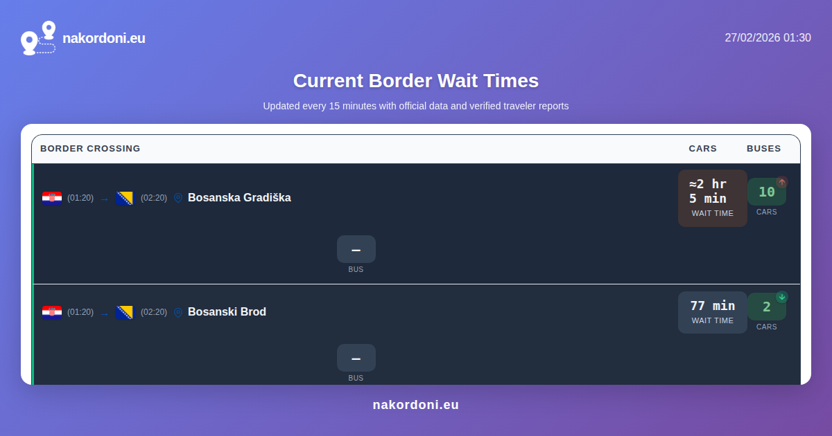 - ✓ og:description — Check live border queue times across Europe. Real-time wait times at Poland, Ukraine, Hungary, Romania, Moldova, Slovakia, Serbia, Turkey crossings. Updated every 15 min.