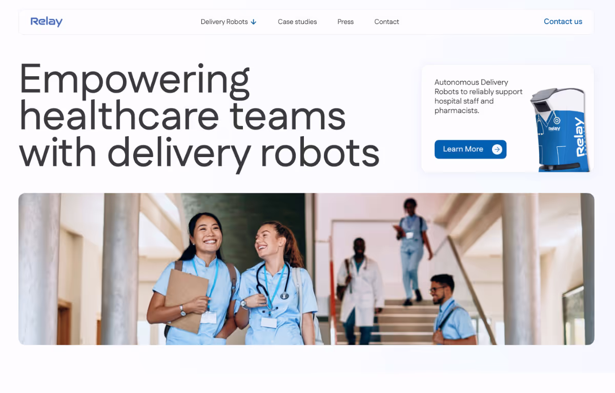 - ✓ og:description — Meet Relay Delivery Robots for Hospitals and Hotels Autonomous delivery robots to reliably support nurses, pharmacists and hotel staff. Autonomous delivery robots to reliably support nurses, pharmacists and hotel staff. Hospital Delivery Robots Hotel Room Service Robots Hospital Delivery Robots Relay hospital delivery robots support nurses in mundane tasks for improved