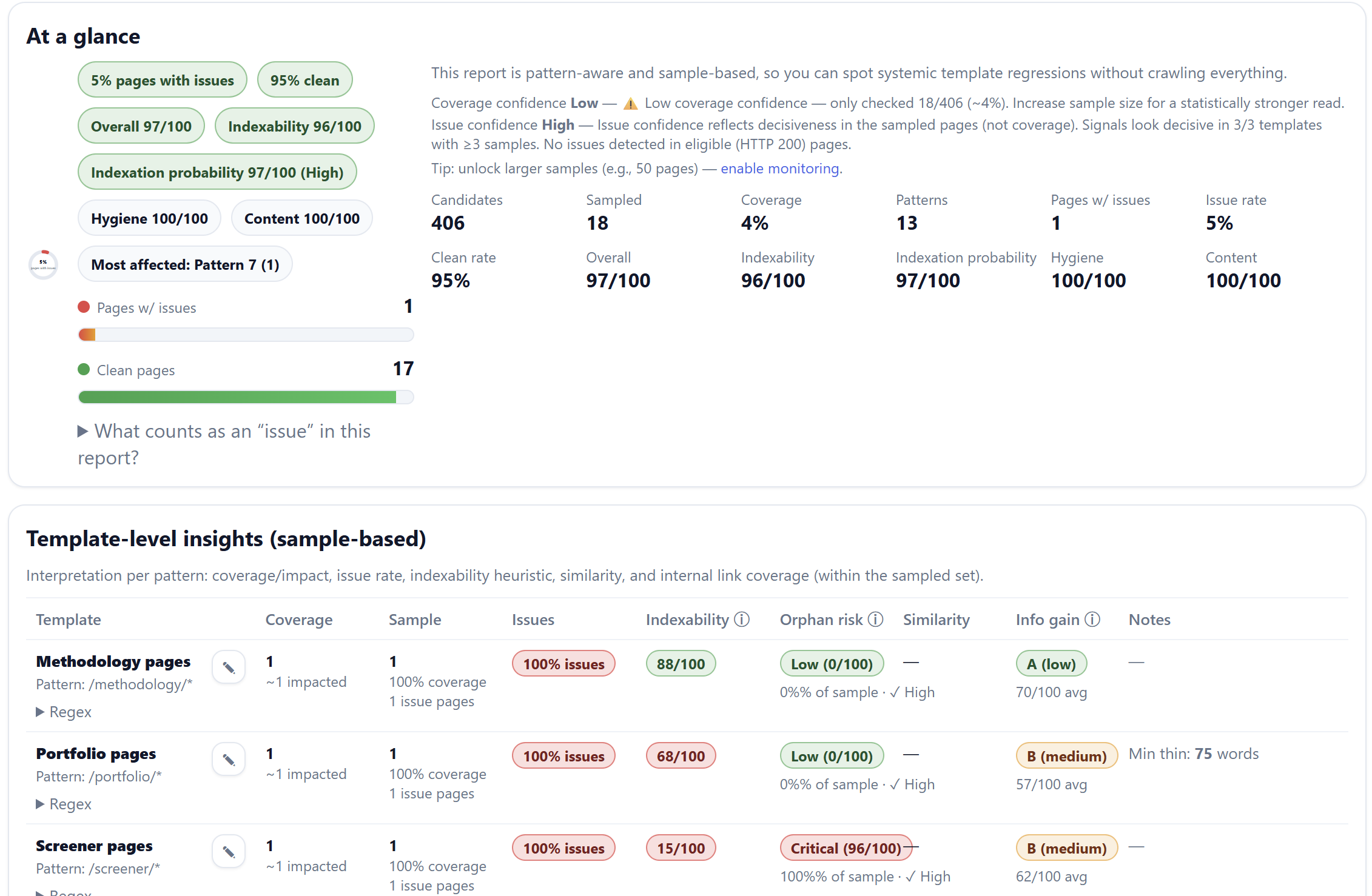 All data is generated automatically and updated with each crawl. JSON exports contain scores and metadata only (no copyrighted content).